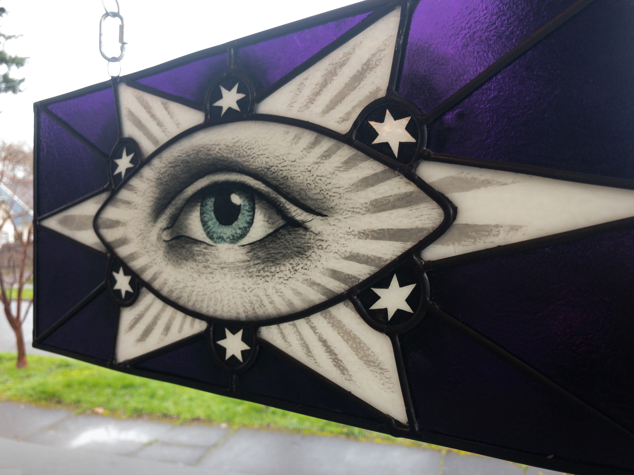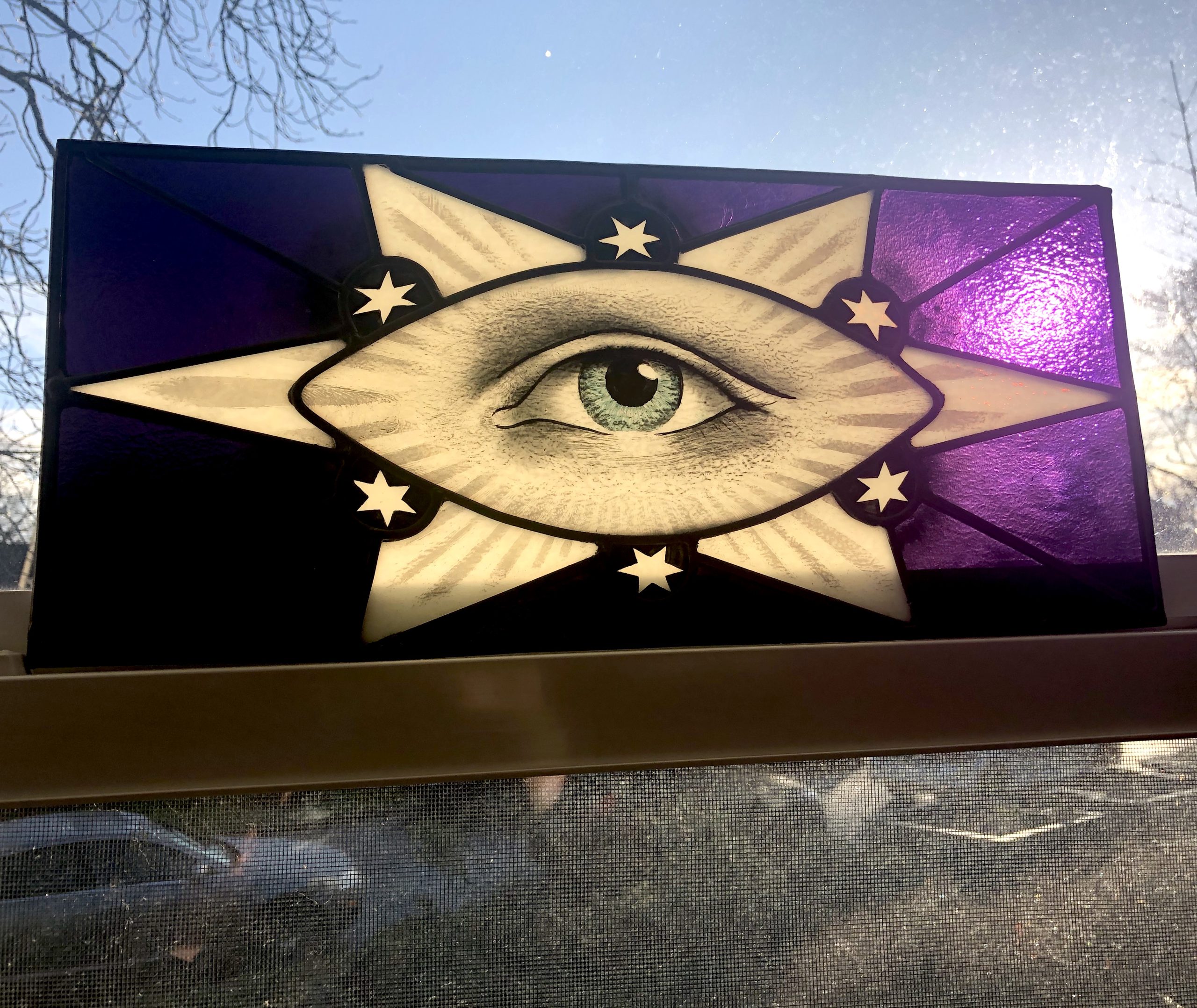 When I was a teen I rode the bus past a building in San Francisco that was nondescript until you looked up and saw mystical symbols in relief on the side. This was my introduction to the imagery of the Odd Fellows. Been stuck on it ever since. This is a riff on it for a transom window. If it was proper symbolism it would have 7 stars and be the all-seeing eye of god, but well… it’s not.